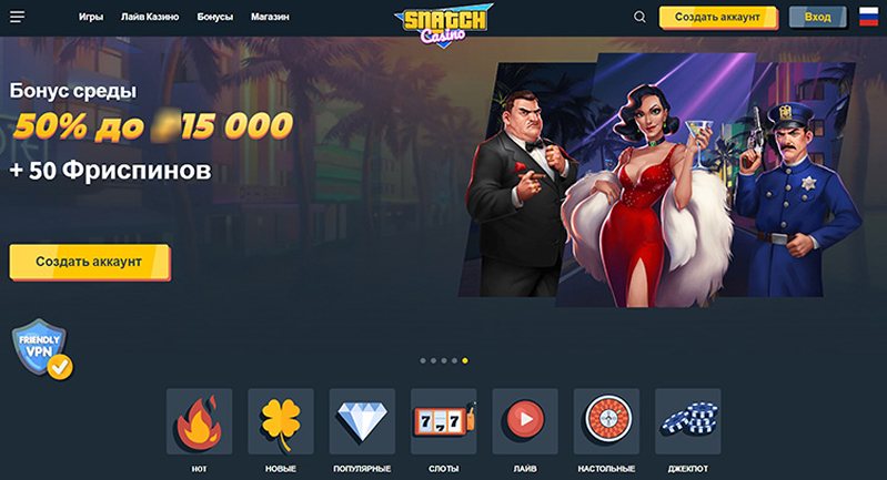 Сайт Snatch Casino стильно оформлен, на главной странице быстро меняются кадры рекламных баннеров с актуальными новостями. Ориентироваться тут легко благодаря панели бокового меню слева под значком с 3 полосками. Первыми там расположены кнопки авторизации, где, нажав «Создать аккаунт», новичку следует заполнить форму: